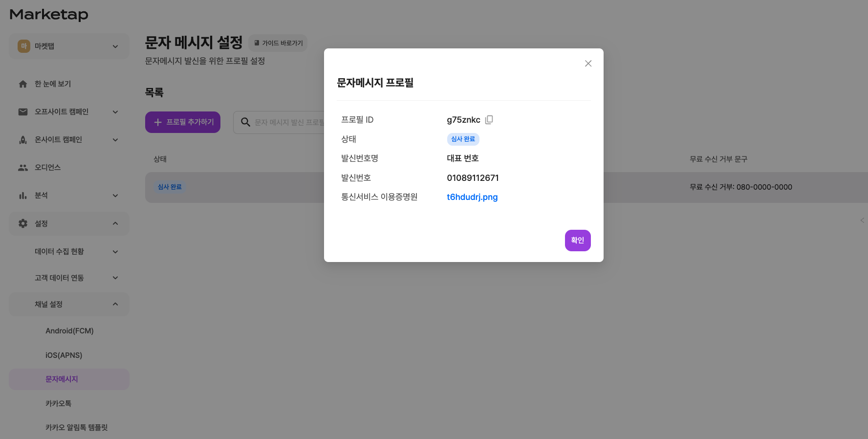 * 발신 프로필 등록 : \[마켓탭 콘솔 > 채널 관리 > 문자 메시지 설정 ]