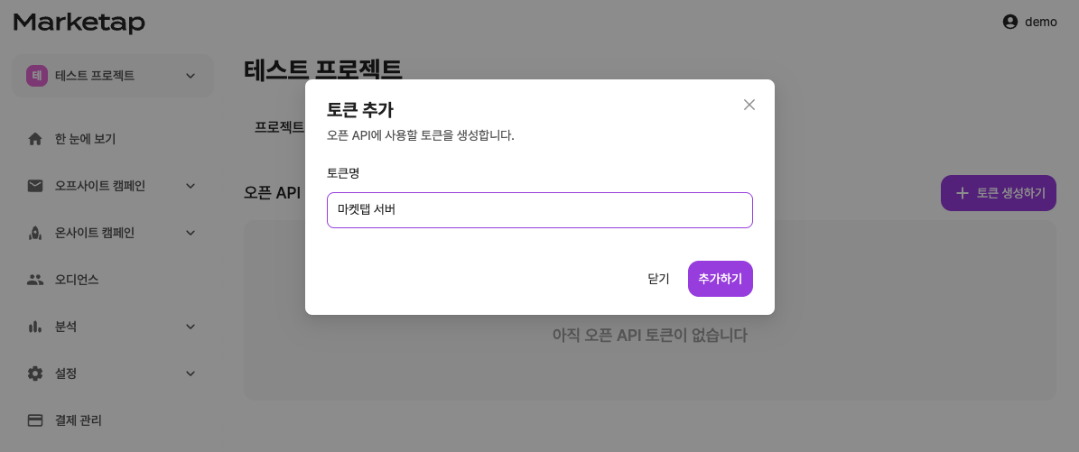토큰 생성하기를 누르고 토큰 구분을 위한 이름을 정의한 뒤 추가하기 버튼을 클릭합니다.