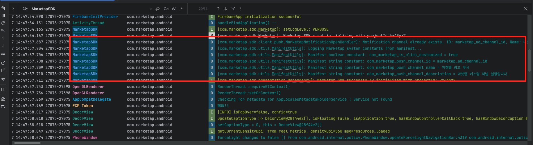 해당 로그는 로그레벨이 Debug일때 출력됩니다. 로그레벨 설정은 [관련 문서](https://docs.marketap.io/t3ZS4WXNMj0HK27EtIMV/developer/advanced-usage/log-level)를 확인해주세요.