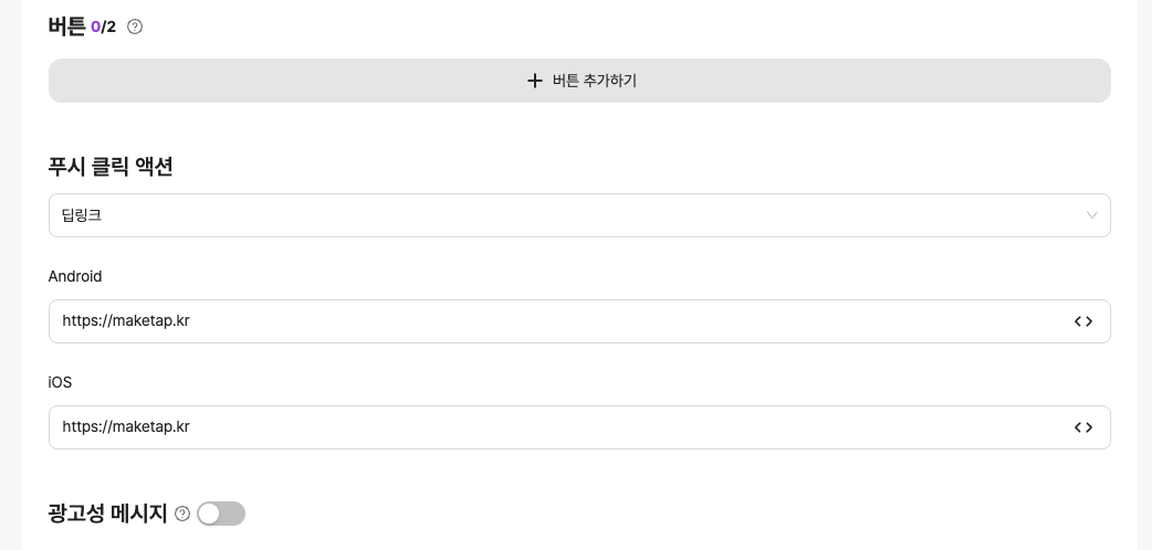 이 시나리오에서는 제목과 본문, 이미지를 입력하고 푸시 클릭 액션을 딥링크로 설정해 플랫폼별 링크를 입력했습니다.