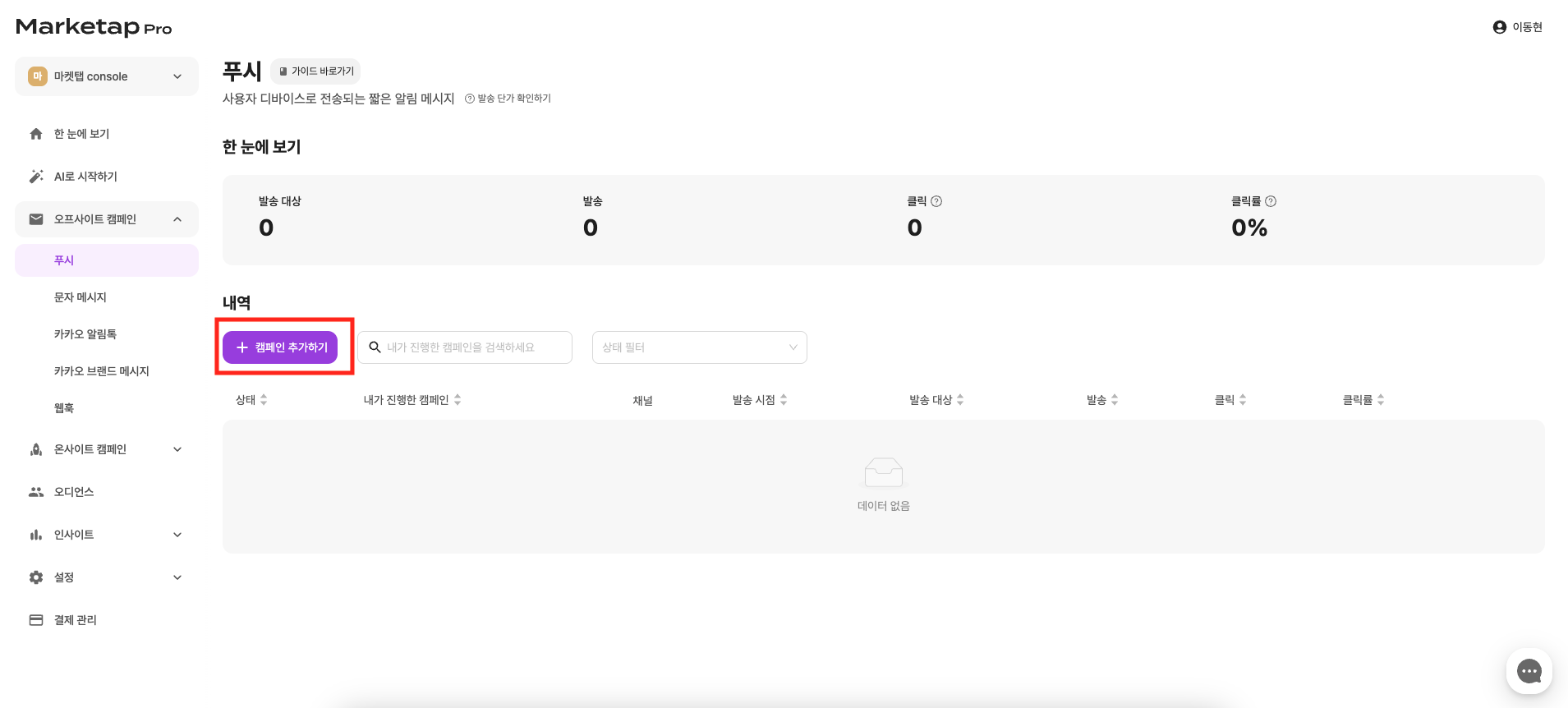 오프사이드 캠페인 > 푸시 메뉴의 캠페인 추가하기를 클릭합니다.