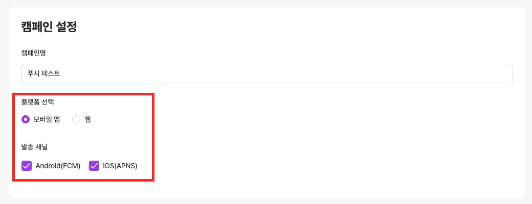 캠페인 설정 섹션에서 플랫폼, 발송 채널을 모바일 - Android, iOS로 지정합니다. (Web Push를 테스트하는 경우 플랫폼을 웹으로 설정합니다.)