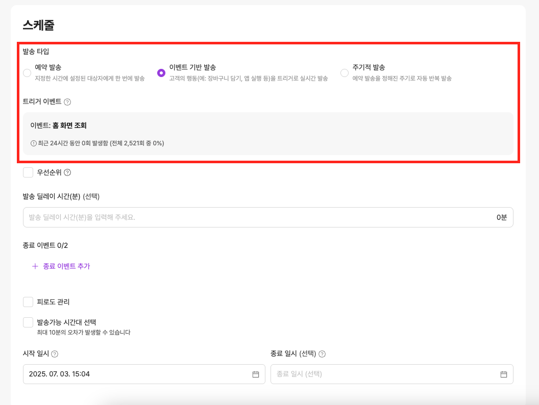 스케줄 섹션에서 이벤트 기반 발송을 선택 후 트리거 이벤트를 `홈 화면 조회` 로 설정합니다. \