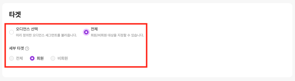 타겟 섹션에서 `전체 > 회원` 으로 설정합니다.