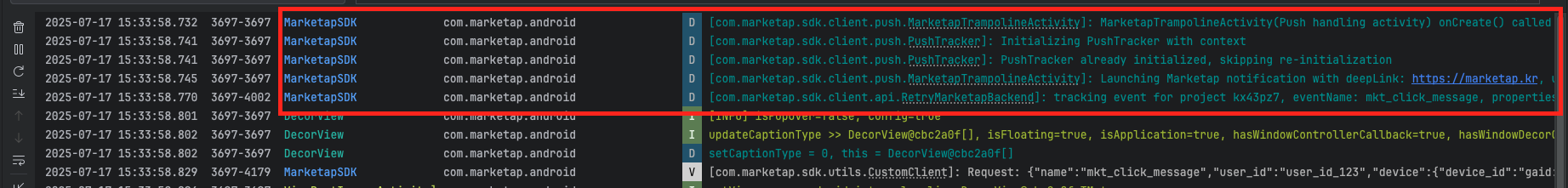 로그레벨을 올바르게 설정하였다면, 앱이 시작할 때 해당 기기의 push token을 출력합니다. 검색 > push token을 통해 Marketap SDK의 로그를 확인하세요.
