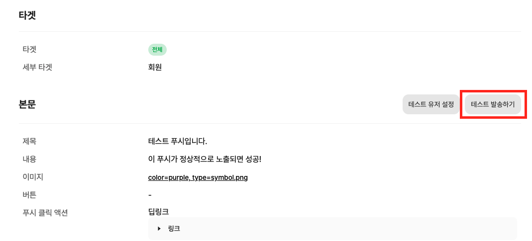 테스트 발송하기는 타겟에 상관없이 테스트할 수 있습니다.