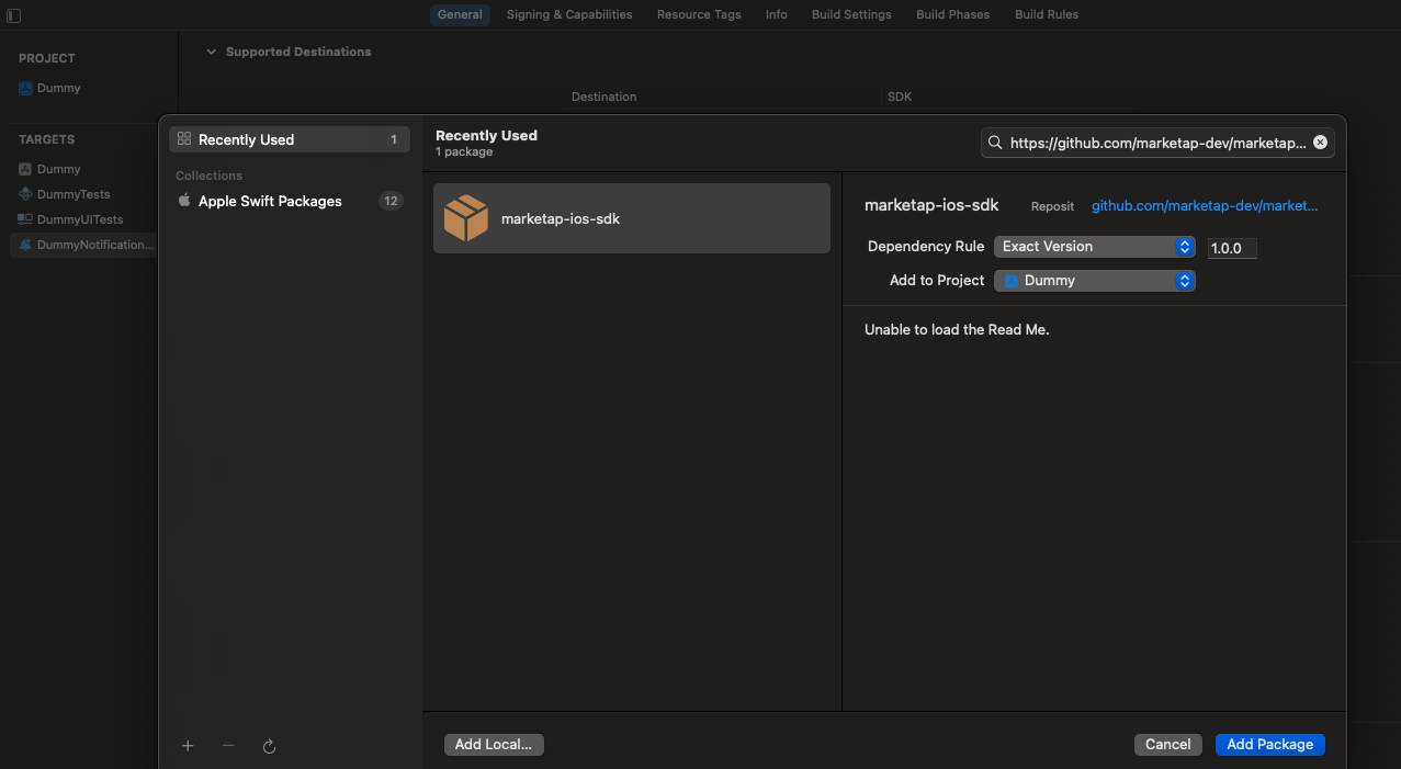 Package URL에 <https://github.com/marketap-dev/marketap-ios-sdk> 를 입력, Up To Next Minor Version LATEST\_VERSION 을 넣고 진행해줍니다.