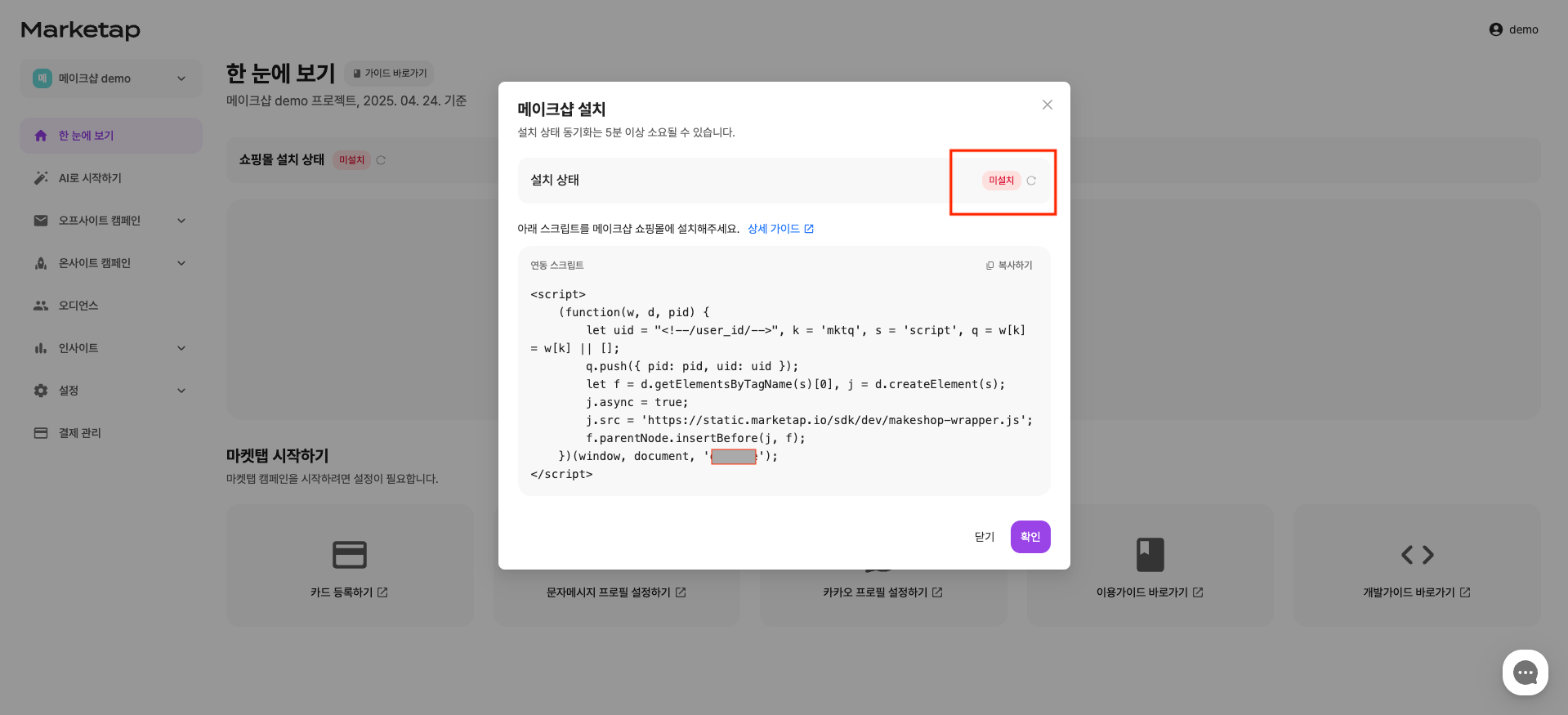 * 연동 상태 및 스크립트는 프로젝트 설정 페이지에서 다시 확인하실 수 있습니다.